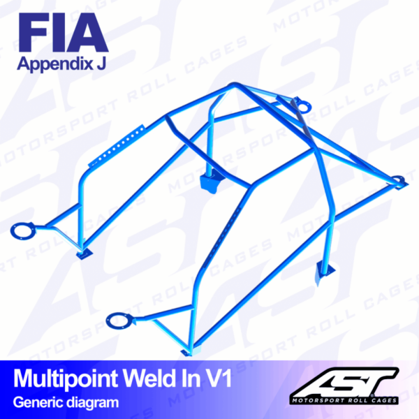 AST Multipoint Weld In V1 Roll cage με 10 σημεία στο αμάξωμα. Οι ενισχυτικές πλάκες είναι χάλυβας πάχους 3mm και σχεδιάζονται και κατασκευάζονται ειδικά για κάθε αυτοκίνητο, επιτυγχάνοντας μέγιστη ασφάλεια και εφαρμογή στο σασί. Το ρολό κλουβί παραδίδεται σε κιτ συγκόλλησης και άβαφο και αποτελείται από ένα κύριο τσέρκι διαμέτρου 45 mm από χάλυβα E355, η υπόλοιπη δομή είναι κατασκευασμένη από χάλυβα διαμέτρου 40 mm σε χάλυβα E355.